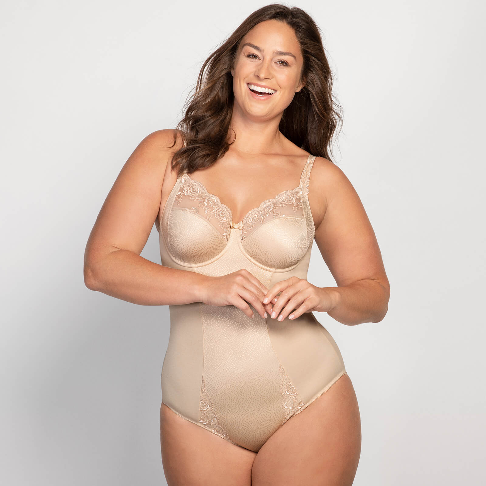 Le body gainant Ella 3673 en couleur biscuit de Ulla Dessous est une lingerie sculptante haut de gamme, conçue spécialement pour les femmes exigeant un maintien parfait, un confort exceptionnel et une silhouette affinée, même dans les tailles généreuses.